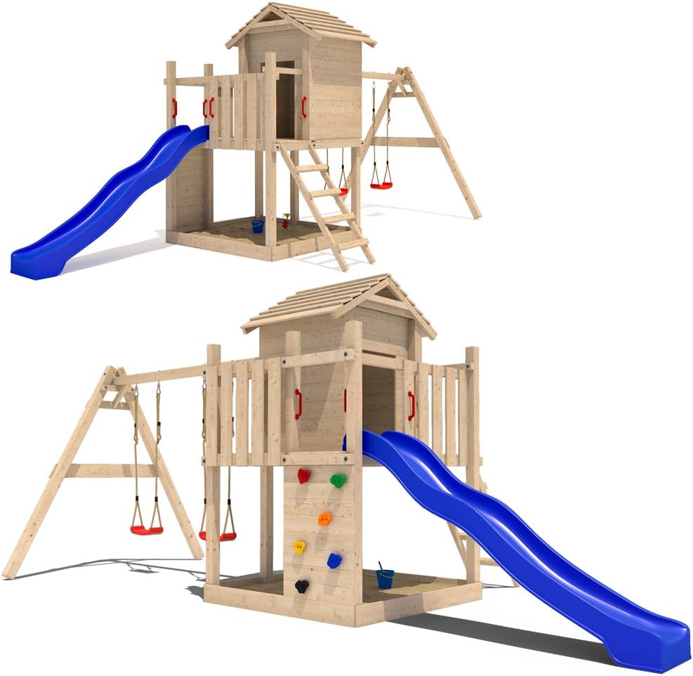 Vor.stelzenhaus mit schaukel und rutsche.