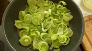 Die äußeren blätter vom lauch entfernen, die stangen der.